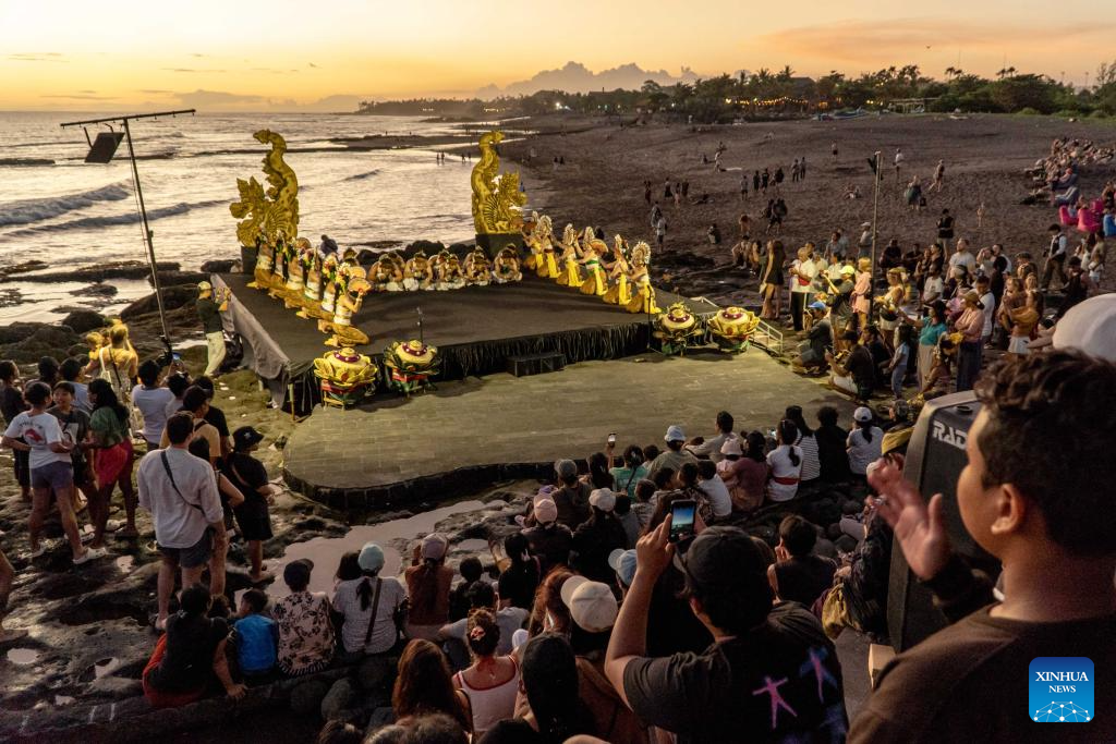 People watch as artists perform the traditional Balinese Janger dance to celebrate International Dance Day at Pererenan Beach in Badung Regency, Bali, Indonesia, April 29, 2025. (Photo by Dicky Bisinglasi/Xinhua)