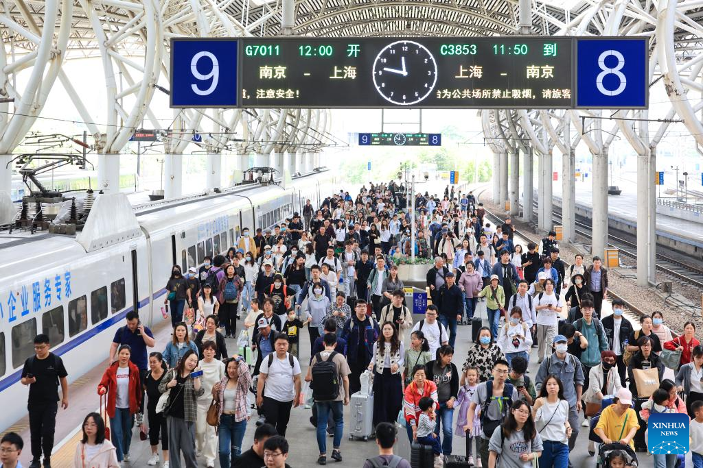 Passengers enter the Nanjing Railway Station in Nanjing, east China's Jiangsu Province, April 30, 2025. China's railway network is expected to handle approximately 144 million passenger trips during the eight-day May Day holiday travel rush, which kicked off on Tuesday, the national railway operator said. (Photo by Su Yang/Xinhua)