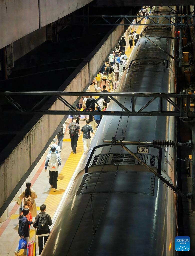 Passengers get off a train at Nanjing Railway Station in Nanjing, east China's Jiangsu Province, April 30, 2025. China's railway network is expected to handle approximately 144 million passenger trips during the eight-day May Day holiday travel rush, which kicked off on Tuesday, the national railway operator said. (Photo by Su Yang/Xinhua)