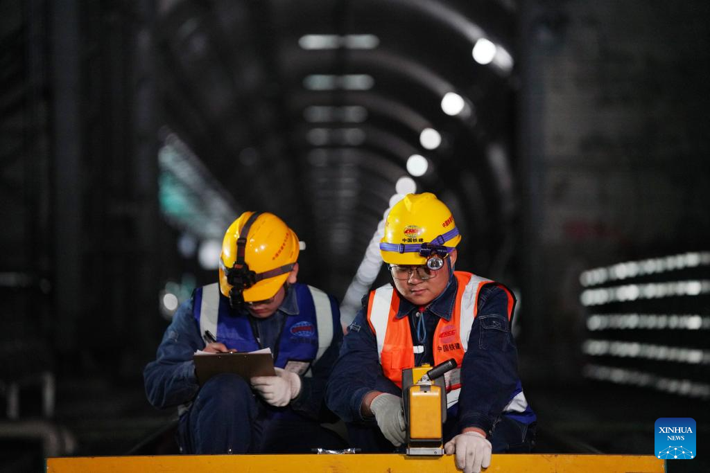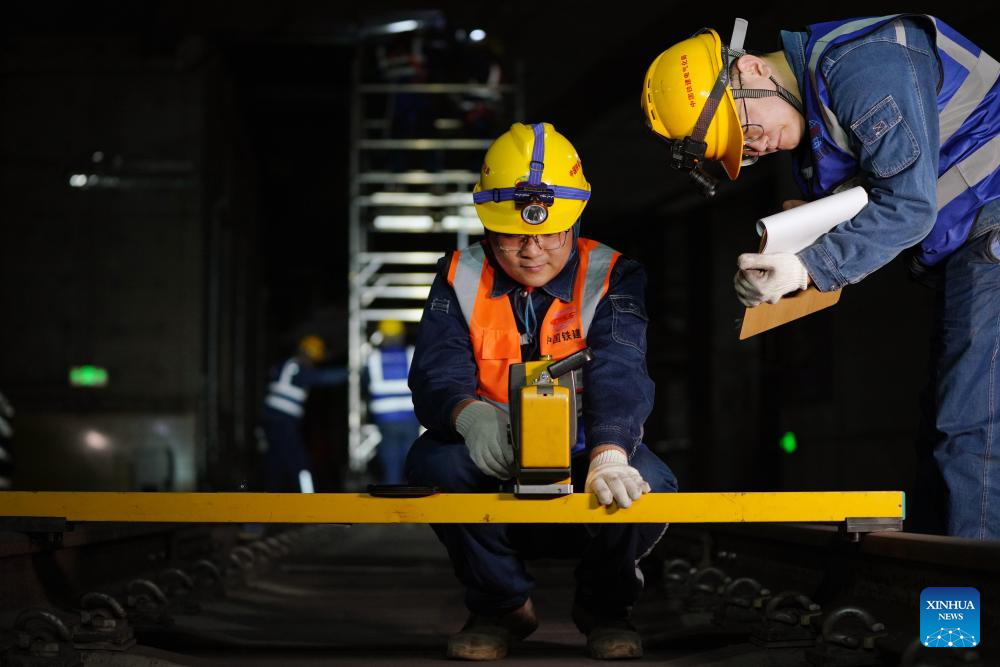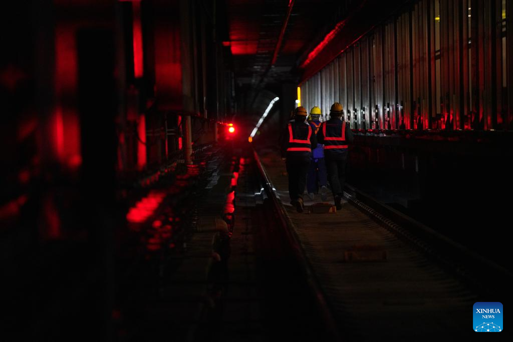 In the stillness of the night, these maintenance workers work industriously through the underground tunnels, ensuring the stable operation of the metro power supply. (Xinhua/Wang Song)