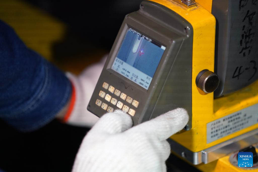 Maintenance worker Lu Wang checks technical parameters during a patrol mission at a station of Metro Line 2 in Harbin, northeast China's Heilongjiang Province, April 30, 2025.(Xinhua/Wang Song)