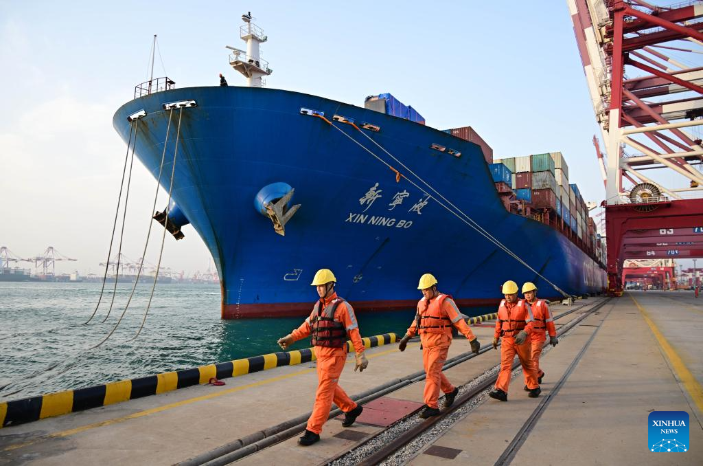 Workers prepare to cast off the ropes for a ship bound for ASEAN countries at a container dock of Qingdao Port in Qingdao, east China's Shandong Province, April 30, 2025. This year, Qingdao port has actively expanded its international shipping routes, especially for the Association of Southeast Asian Nations (ASEAN). The direct cargo shipping routes from Qingdao Port to the ASEAN countries has increased to 50, with the cargo volume from Qingdao to ASEAN countries up six percent year-on-year in the first quarter of this year. (Xinhua/Li Ziheng)
