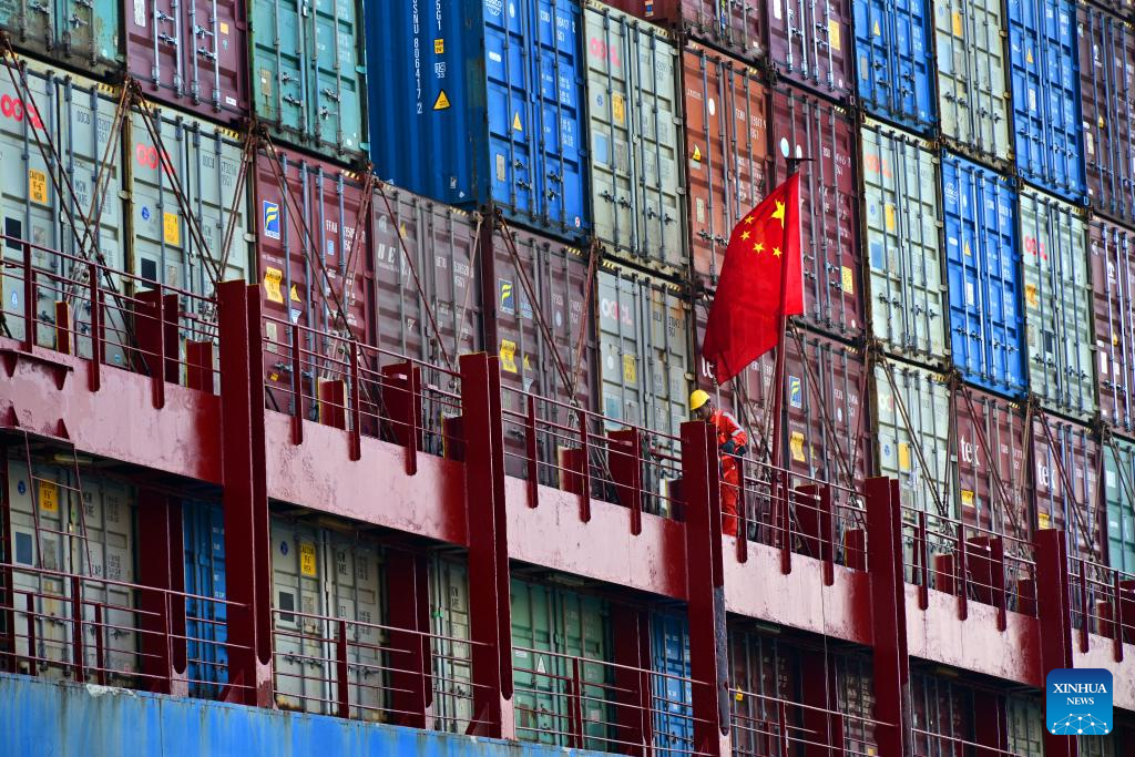 A worker checks the piling of containers on a ship at a cargo dock of Qingdao Port in Qingdao, east China's Shandong Province, April 30, 2025. This year, Qingdao port has actively expanded its international shipping routes, especially for the Association of Southeast Asian Nations (ASEAN). The direct cargo shipping routes from Qingdao Port to the ASEAN countries has increased to 50, with the cargo volume from Qingdao to ASEAN countries up six percent year-on-year in the first quarter of this year. (Xinhua/Li Ziheng)