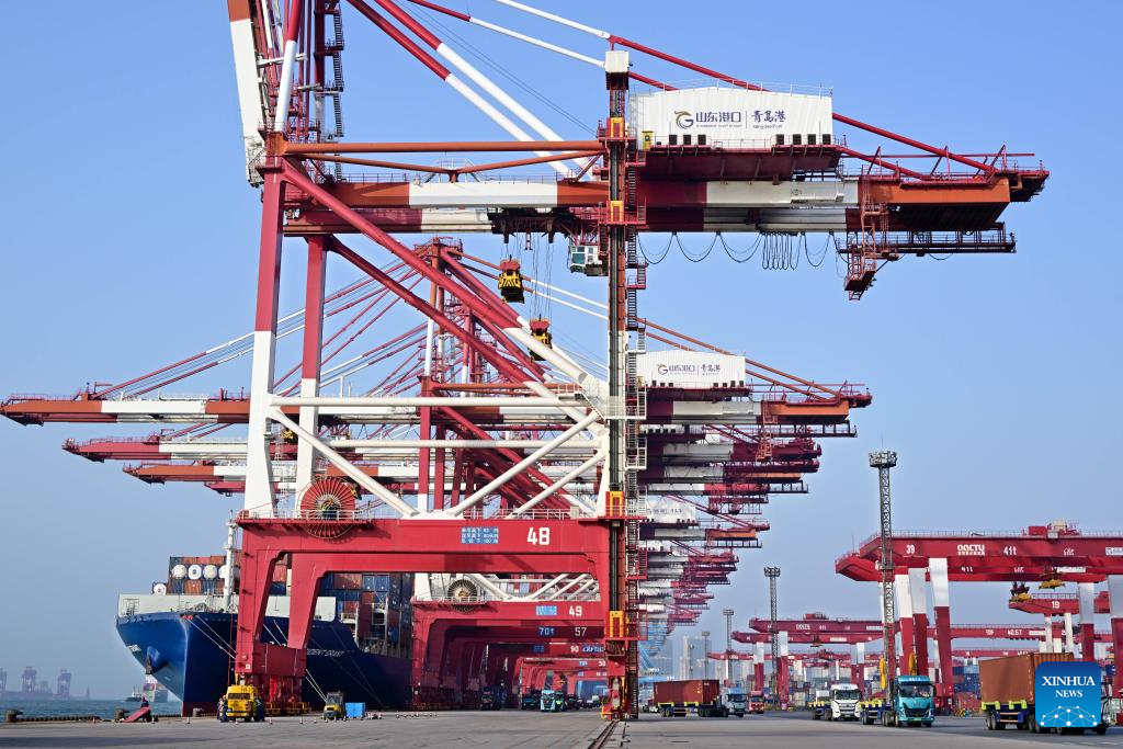 This photo taken on April 30, 2025 shows a container dock of Qingdao Port in Qingdao, east China's Shandong Province. This year, Qingdao port has actively expanded its international shipping routes, especially for the Association of Southeast Asian Nations (ASEAN). The direct cargo shipping routes from Qingdao Port to the ASEAN countries has increased to 50, with the cargo volume from Qingdao to ASEAN countries up six percent year-on-year in the first quarter of this year. (Xinhua/Li Ziheng)