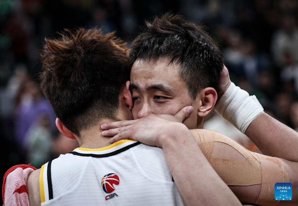 Sun Minghui of Zhejiang Lions hugs Zhao Jiwei (R) of Liaoning Flying Leopards after the 3rd leg of semifinal between Liaoning Flying Leopards and Zhejiang Lions at the 2024-2025 season of the Chinese Basketball Association (CBA) league in Shenyang, northeast China's Liaoning Province, May 1, 2025. (Xinhua/Pan Yulong)