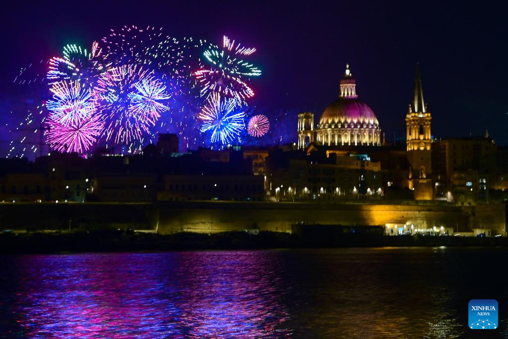 This photo taken on April 30, 2025 shows fireworks during the grand finale of the Malta International Fireworks Festival in Sliema, Malta. (Photo by Jonathan Borg/Xinhua)