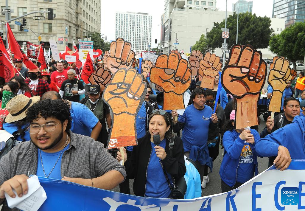 Thousands of people gathered in downtown Los Angeles on Thursday for International Workers' Day rallies and marches, organized by the Los Angeles May Day Coalition, to advocate for workers' and immigrants' rights. (Photo by Qiu Chen/Xinhua)