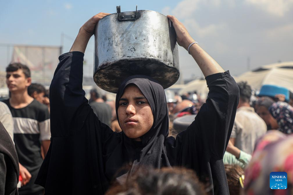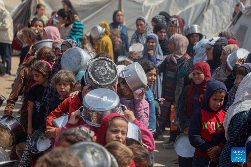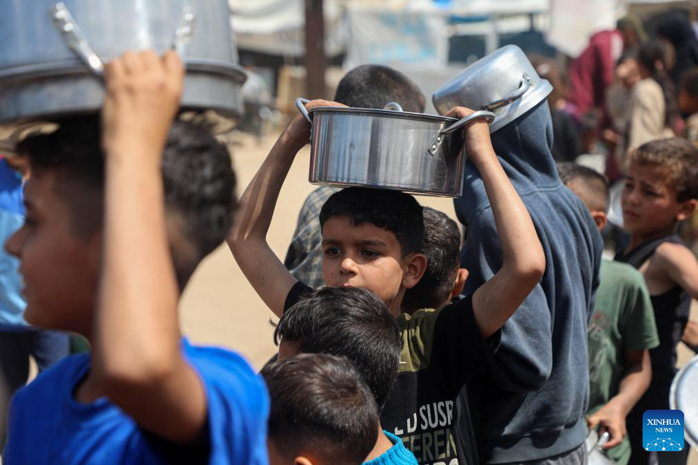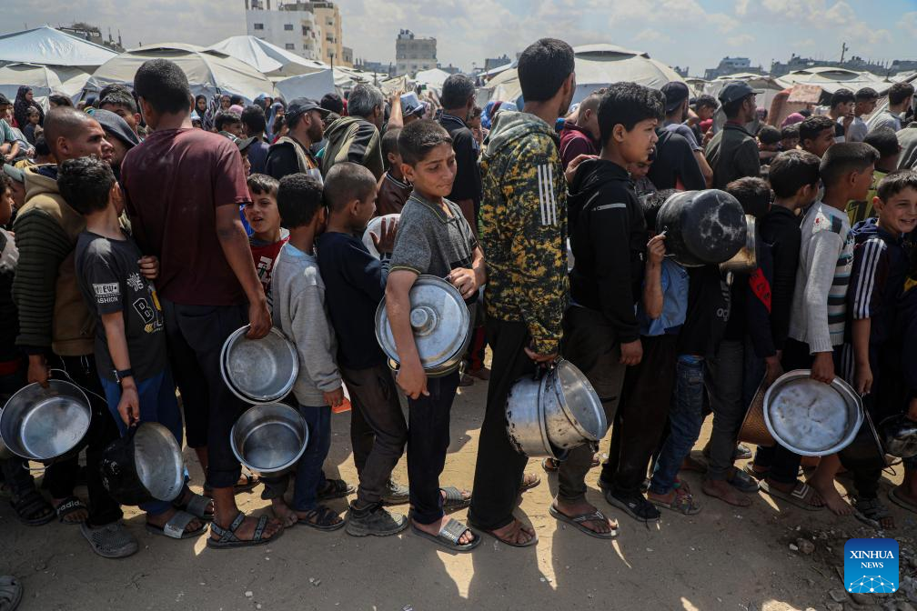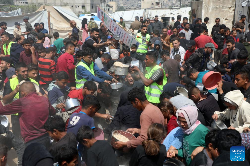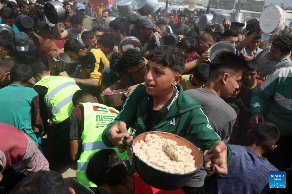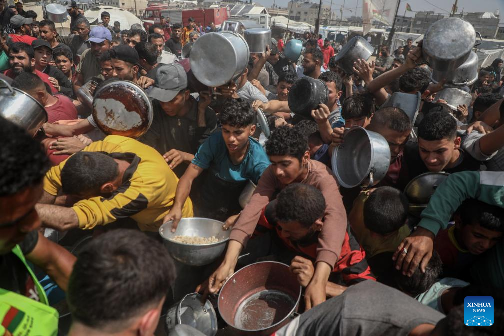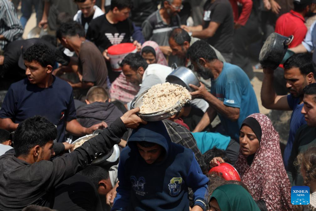 Palestinians receive free food from a food distribution center in Gaza City, on May 2, 2025. The United Nations Relief and Works Agency for Palestine Refugees in the Near East (UNRWA) said Friday that the ongoing Israeli blockade is worsening the humanitarian situation in the Gaza Strip, particularly affecting women and children. (Photo by Rizek Abdeljawad/Xinhua)