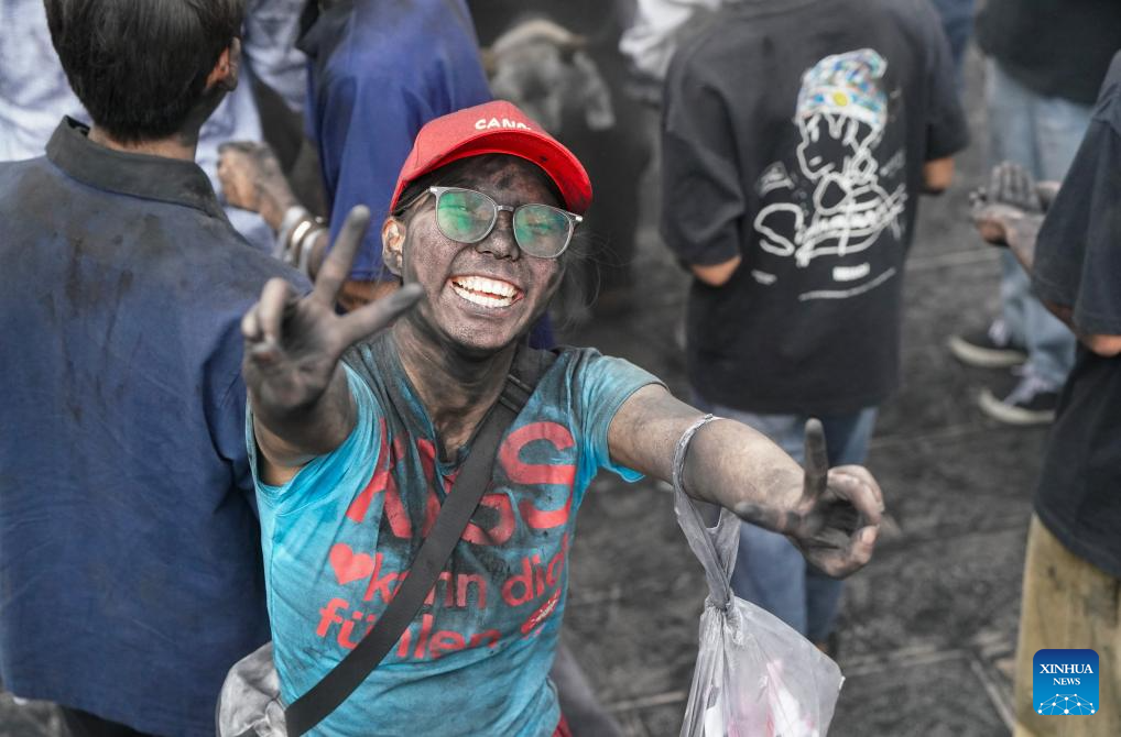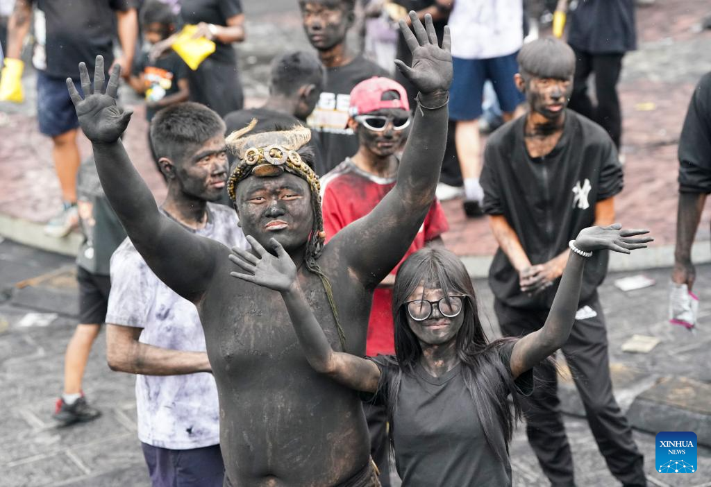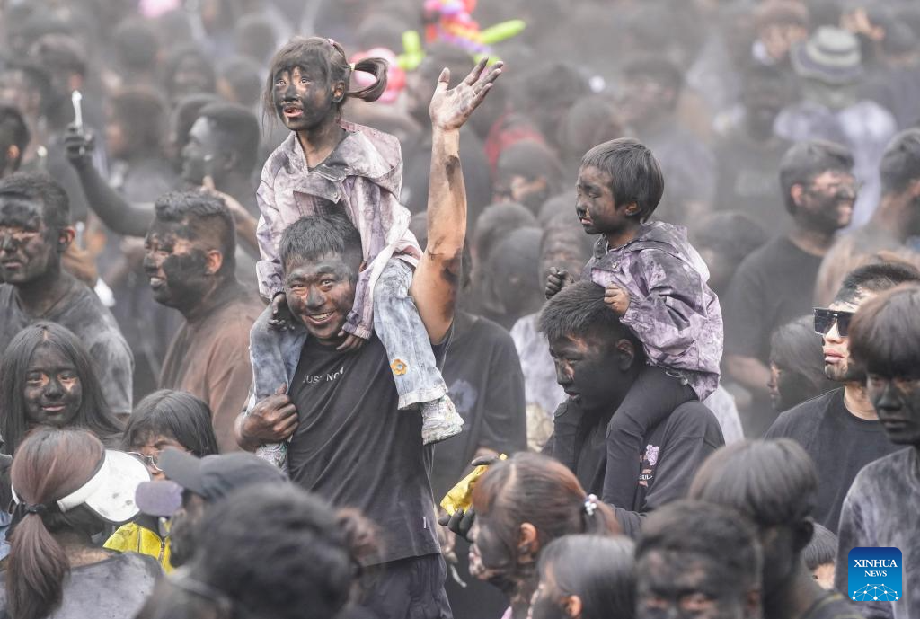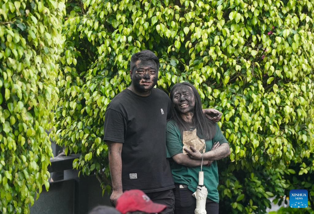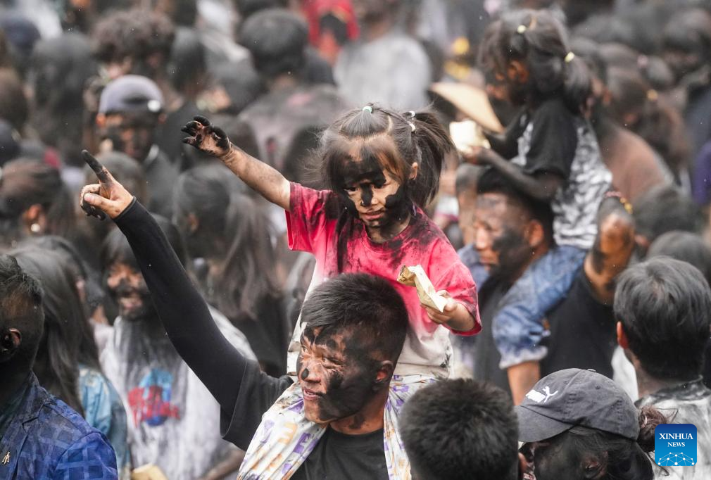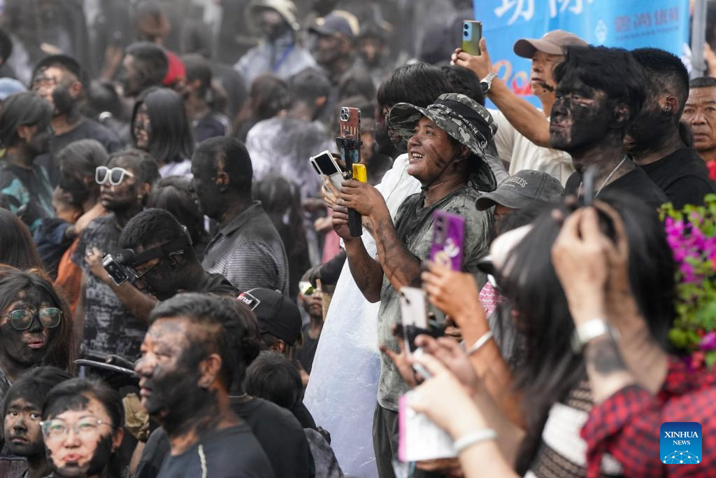 People take part in a folk event called "daubing face black" in Mojiang Hani Autonomous County of Pu'er City, southwest China's Yunnan Province, May 2, 2025. The traditional event is held here on Friday as people wish for good luck by daubing each others' faces black. (Xinhua/Chen Xinbo)