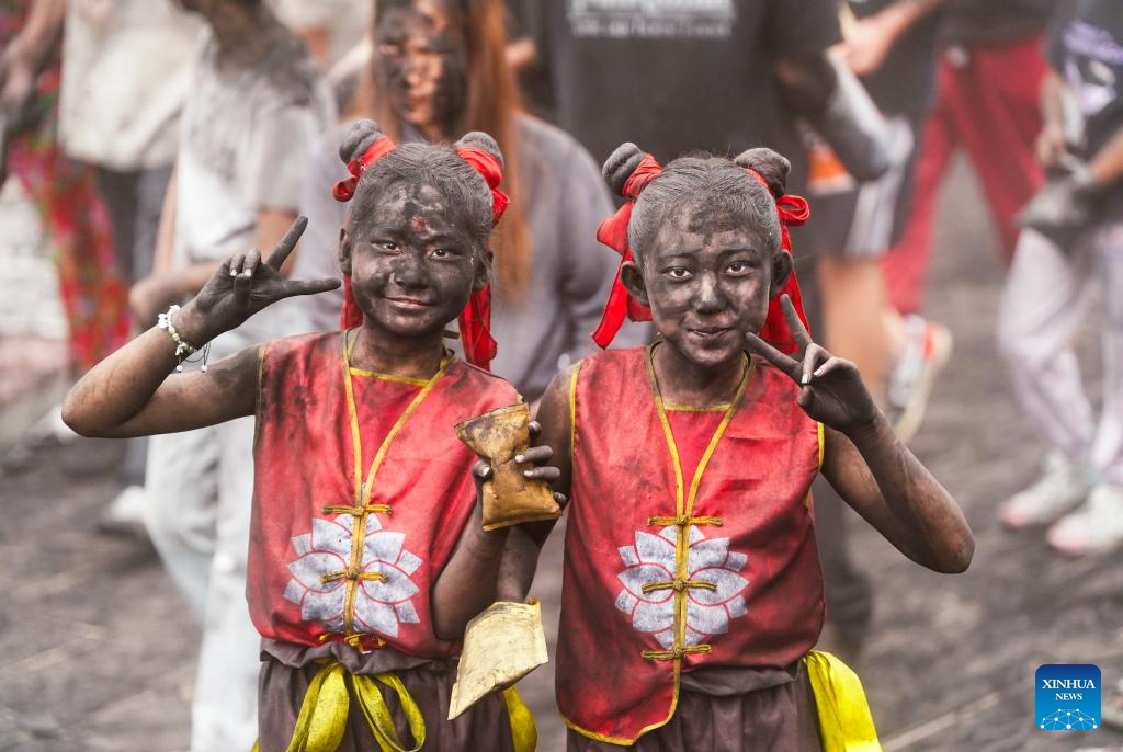 Children pose for photos during a folk event called "daubing face black" in Mojiang Hani Autonomous County of Pu'er City, southwest China's Yunnan Province, May 2, 2025. The traditional event is held here on Friday as people wish for good luck by daubing each others' faces black. (Xinhua/Chen Xinbo)
