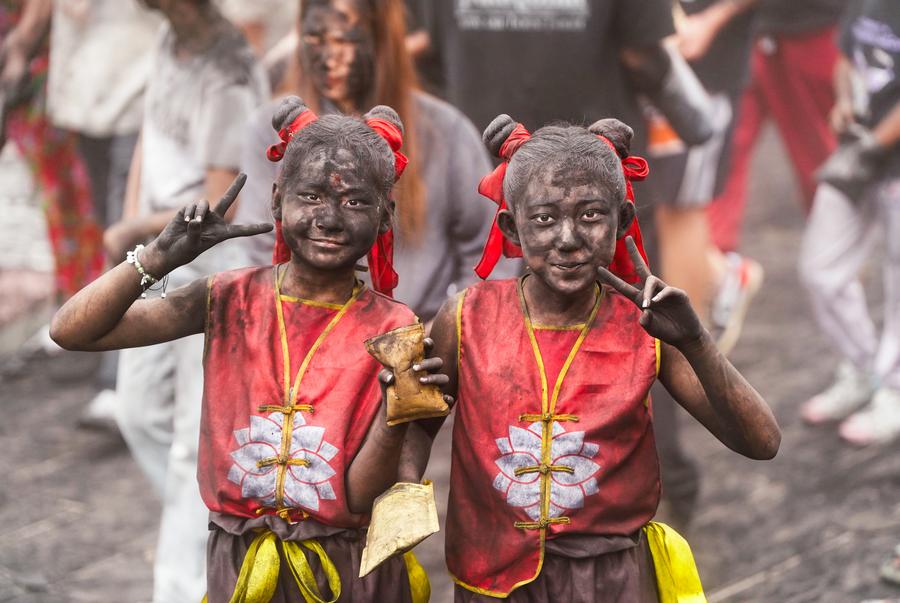 Children pose for photos during a folk event called "daubing face black" in Mojiang Hani Autonomous County of Pu'er City, southwest China's Yunnan Province, May 2, 2025. (Xinhua/Chen Xinbo)