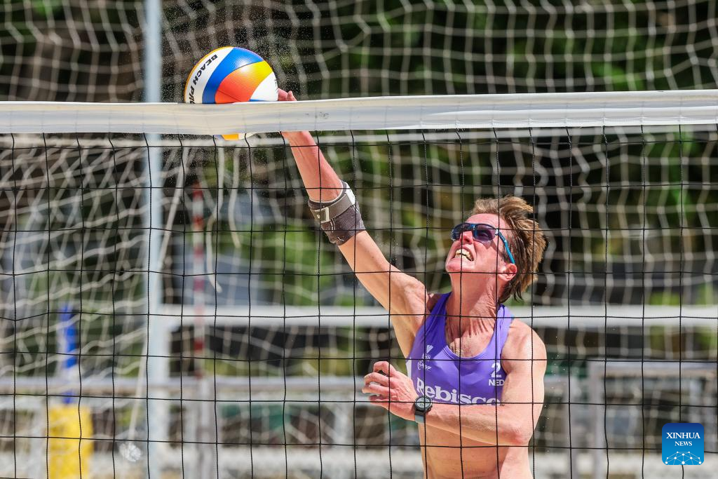 Annemieke Driessen of the Netherlands competes during the women's pool A match between Melissa Powell/Lindsey Calvin of the United States and Danieke Prins/Annemieke Driessen of the Netherlands at the Volleyball World Beach Pro Tour Futures in Laguna Province, the Philippines, May 2, 2025. (Xinhua/Rouelle Umali)