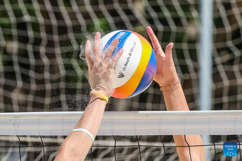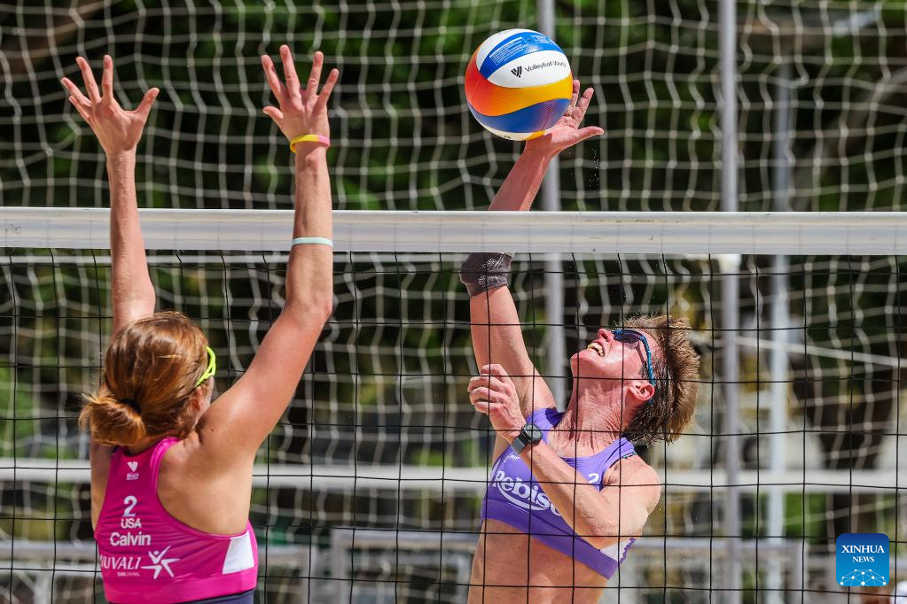 Lindsey Calvin (R) of the United States competes against Danieke Prins of the Netherlands during the women's pool A match between Melissa Powell/Lindsey Calvin of the United States and Danieke Prins/Annemieke Driessen of the Netherlands at the Volleyball World Beach Pro Tour Futures in Laguna Province, the Philippines, May 2, 2025. (Xinhua/Rouelle Umali)