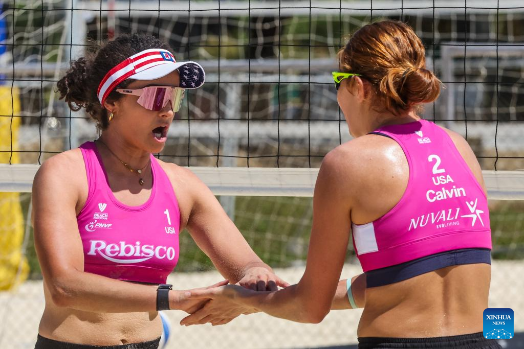 Lindsey Calvin and Melissa Powell (L) of the United States celebrate after scoring a point during the women's pool A match between Melissa Powell/Lindsey Calvin of the United States and Danieke Prins/Annemieke Driessen of the Netherlands at the Volleyball World Beach Pro Tour Futures in Laguna Province, the Philippines, May 2, 2025. (Xinhua/Rouelle Umali)