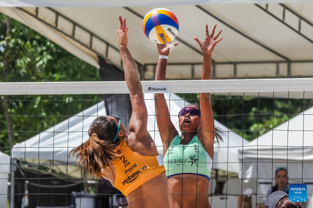 Cherry Ann Rondina (R) of the Philippines competes against Sofiah Shanine Pagara of the Philippines during the women's pool A match between Khylem Harl Progella/Sofiah Shanine Pagara of the Philippines and Cherry Ann Rondina/Bernadeth Pons of the Philippines at the Volleyball World Beach Pro Tour Futures in Laguna Province, the Philippines, May 2, 2025. (Xinhua/Rouelle Umali)