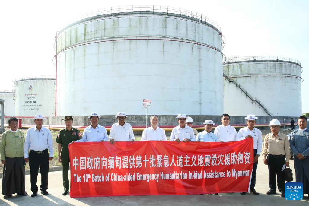 Participants pose for a group photo during the handover ceremony of the tenth batch of emergency humanitarian aid supplies dispatched by the Chinese government in Yangon, Myanmar, May 2, 2025. The tenth batch of emergency humanitarian aid supplies dispatched by the Chinese government was handed over to Myanmar on Friday in Yangon. The aid supplies included 18,000 tons of diesel oil. Yangon Region Chief Minister U Soe Thein accepted them in Yangon. (Xinhua/Myo Kyaw Soe)