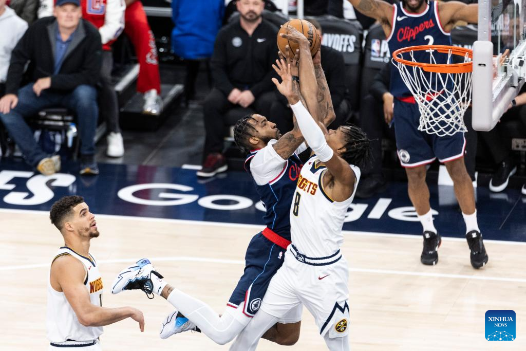 Los Angeles Clippers' Kawhi Leonard (R) goes to the basket against Denver Nuggets' Peyton Watson (C) during the 2024-2025 NBA first-round playoff basketball match between Los Angeles Clippers and Denver Nuggets in Los Angeles, the United States, May 1, 2025. (Photo by Ringo Chiu/Xinhua)