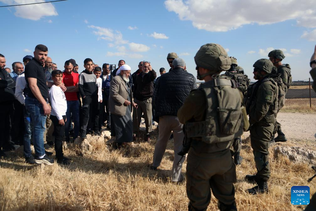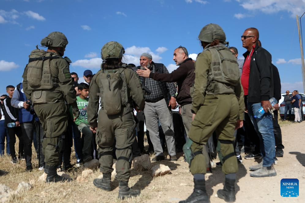 Israeli soldiers prevent Palestinians from accessing their lands in the ad-Dhahiriya, south of the West Bank city of Hebron, on May 2, 2025. (Photo by Mamoun Wazwaz/Xinhua)