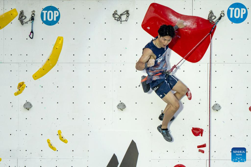 Yoshida Satone of Japan reacts during the men's lead qualification at the IFSC Climbing World Cup Bali 2025 in Bali, Indonesia, May 2, 2025. (Photo by Dicky Bisinglasi/Xinhua)