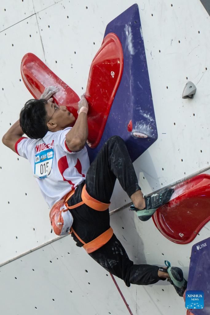 Raviandi Ramadhan of Indonesia competes during the men's lead qualification at the IFSC Climbing World Cup Bali 2025 in Bali, Indonesia, May 2, 2025. (Photo by Dicky Bisinglasi/Xinhua)