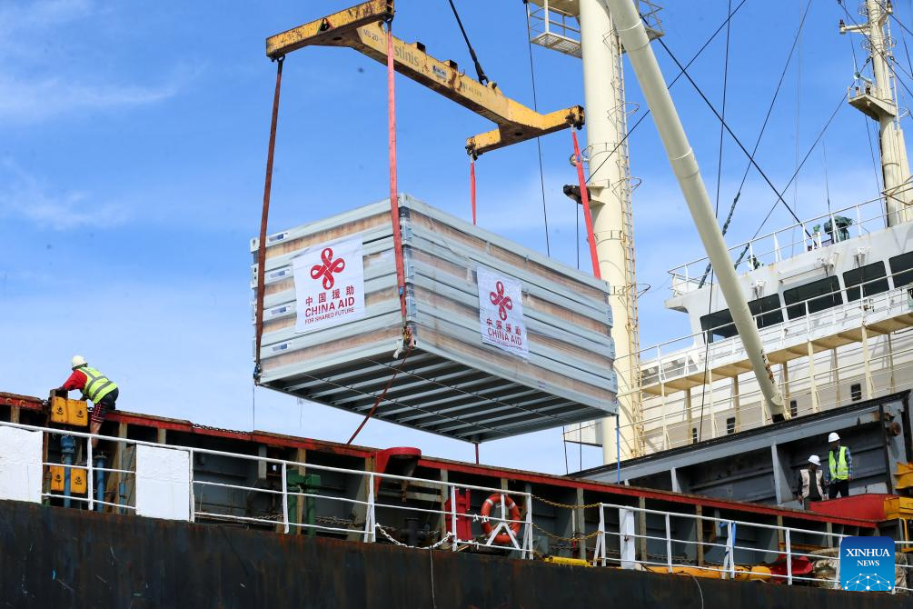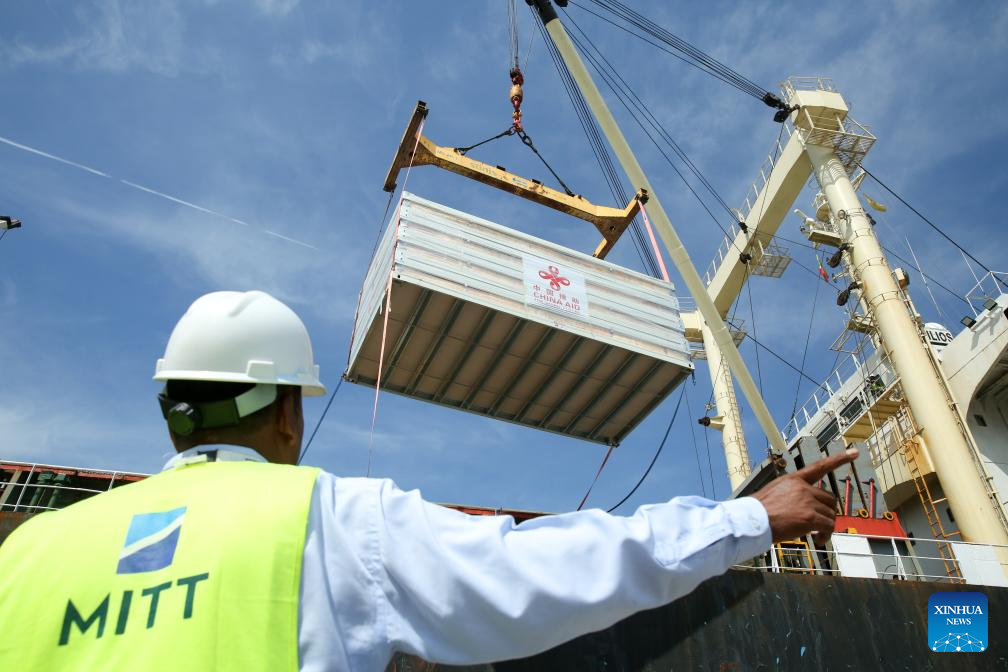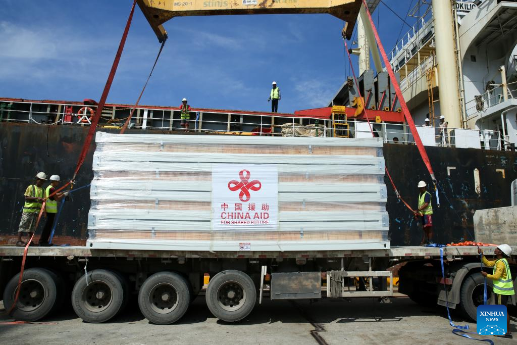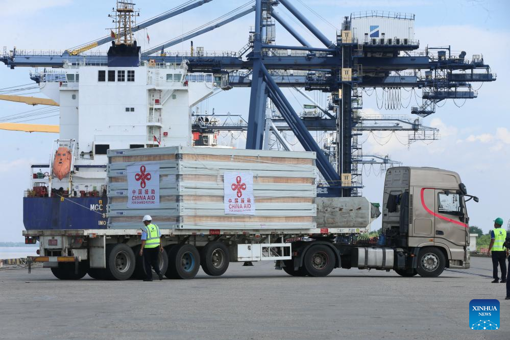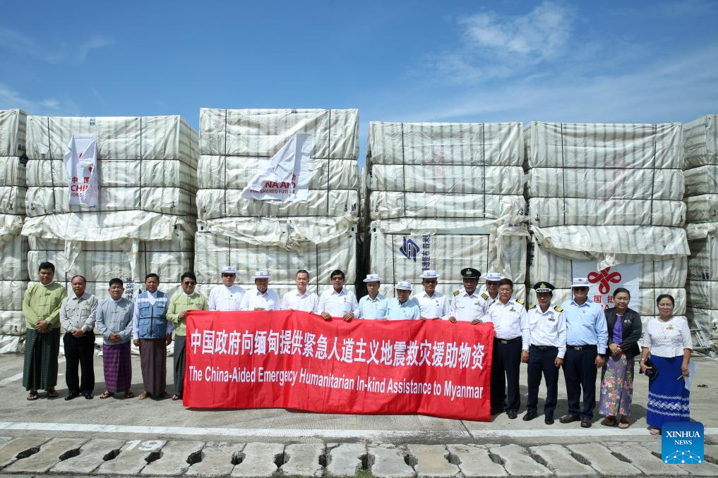 The eleventh batch of emergency humanitarian aid supplies dispatched by the Chinese government arrives in Yangon, Myanmar, May 3, 2025. The eleventh batch of emergency humanitarian aid supplies dispatched by the Chinese government was handed over to Myanmar on Saturday in Yangon, Myanmar. (Xinhua/Myo Kyaw Soe)