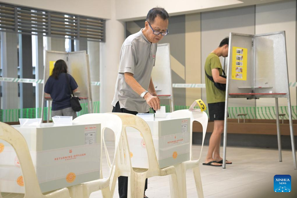 Voters are seen at a polling station for the general election in Singapore's Woodleigh, May 3, 2025. Polling stations across Singapore opened at 8:00 a.m. local time (0000 GMT) on Saturday for the country's general election. (Photo by Then Chih Wey/Xinhua)
