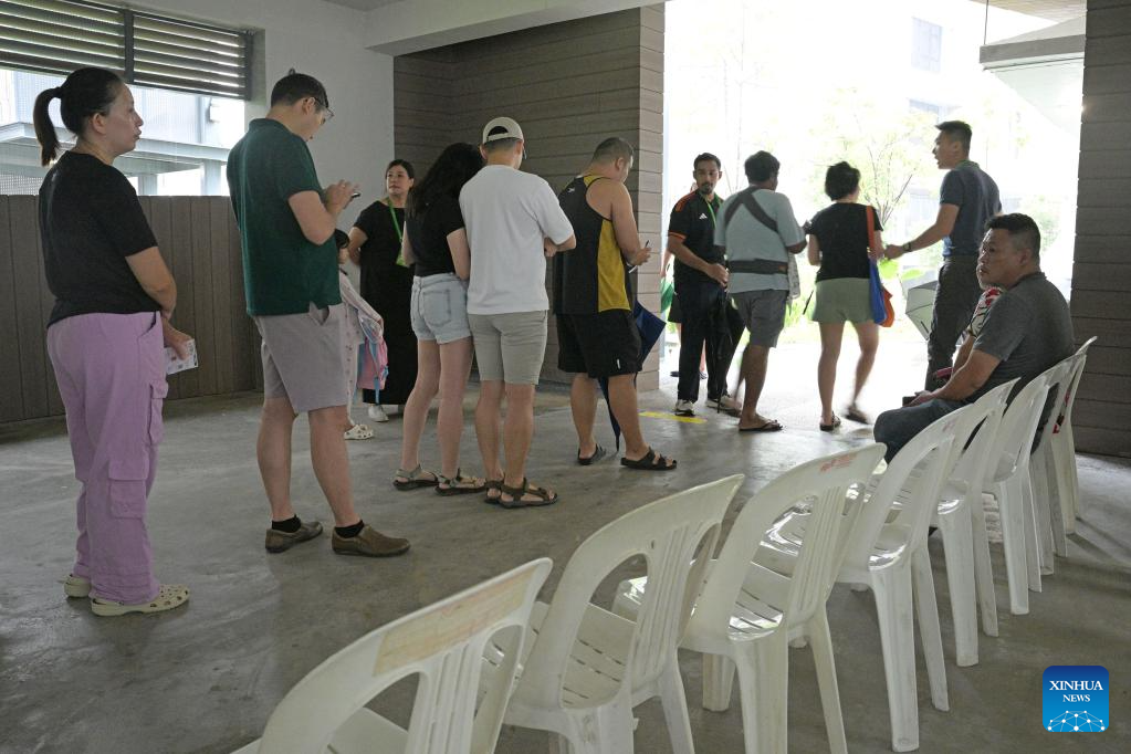Voters line up to cast their ballots for the general election at a polling station in Singapore's Woodleigh, May 3, 2025. Polling stations across Singapore opened at 8:00 a.m. local time (0000 GMT) on Saturday for the country's general election. (Photo by Then Chih Wey/Xinhua)