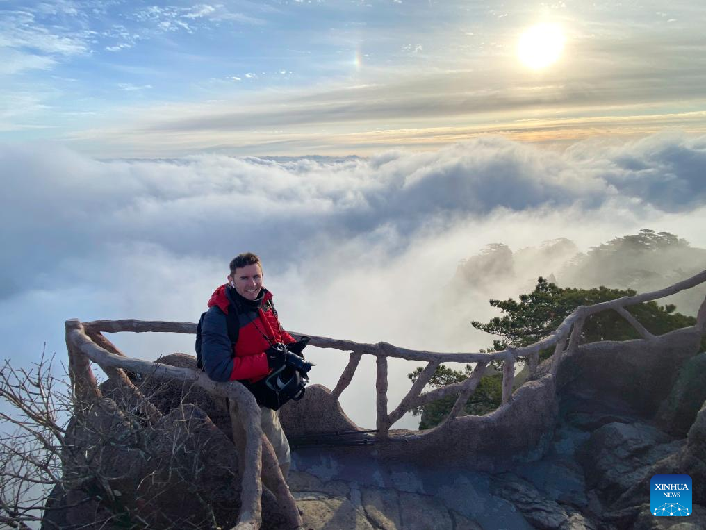 French photographer Nicolas Cornet poses for a photo on the Huangshan Mountain in east China's Anhui Province. (Xinhua)