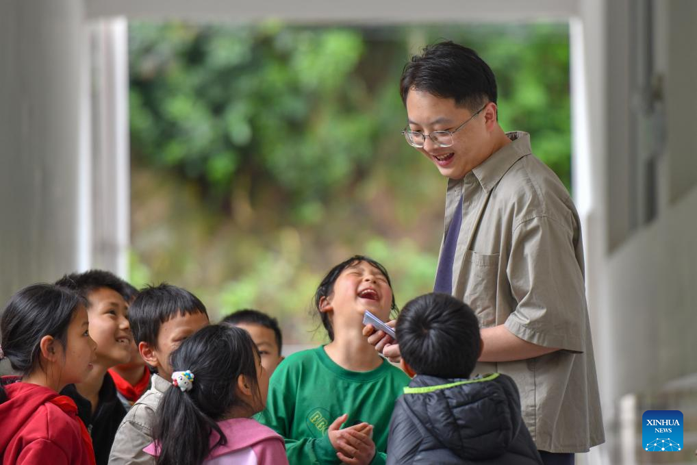 Li Runnan plays with children at a primary school in Wangu Village of Yanjin County, Zhaotong City, southwest China's Yunnan Province, April 29, 2025. (Photo by Peng Yikai/Xinhua)