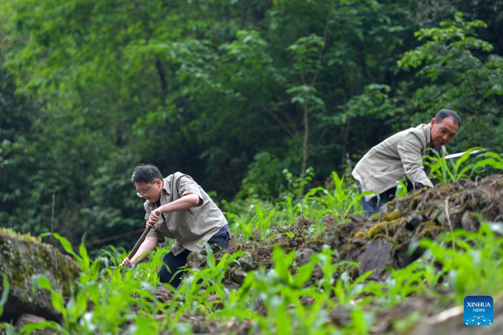 Li Runnan (L) works with a local villager in Wangu Village of Yanjin County, Zhaotong City, southwest China's Yunnan Province, April 30, 2025. (Photo by Peng Yikai/Xinhua)