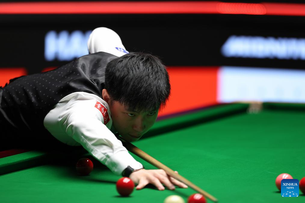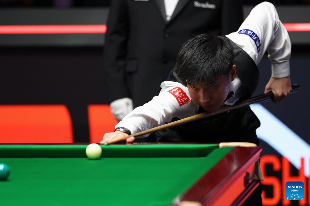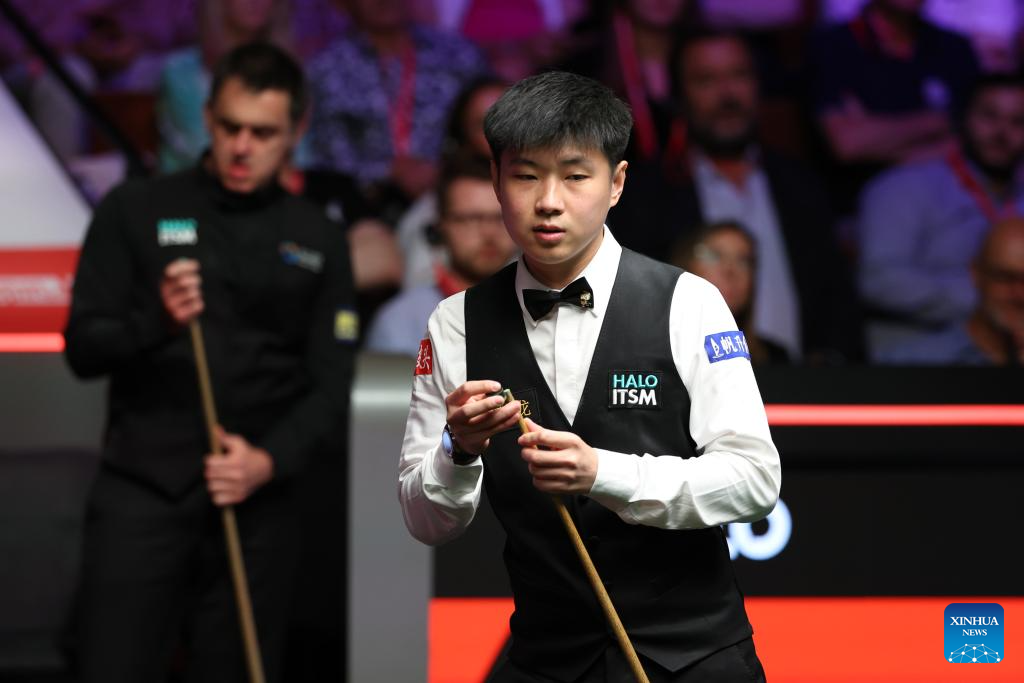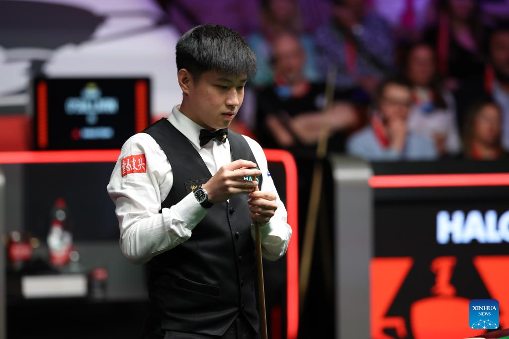 Zhao Xintong plays a shot during the semifinal match between Ronnie O'Sullivan of England and Zhao Xintong of China at World Snooker Championship 2025 in Sheffield, Britain, May 2, 2025. (Photo by Zhai Zheng/Xinhua)