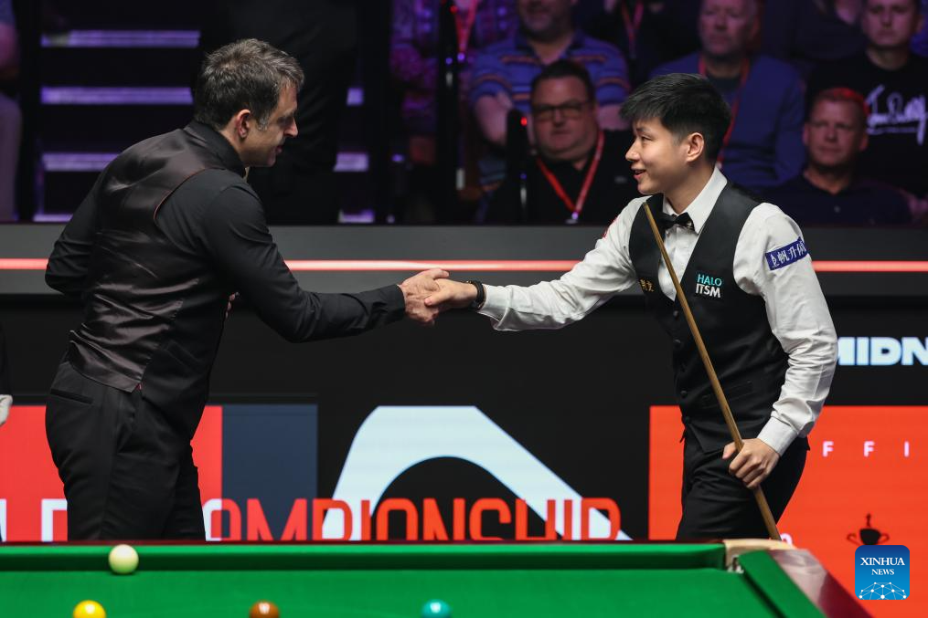 Zhao Xintong (R) greets Ronnie O'Sullivan before the semifinal match between Ronnie O'Sullivan of England and Zhao Xintong of China at World Snooker Championship 2025 in Sheffield, Britain, May 2, 2025. (Photo by Zhai Zheng/Xinhua)