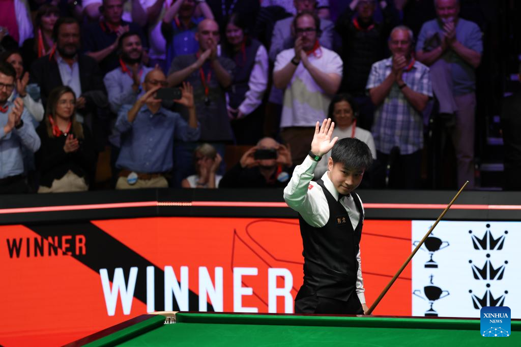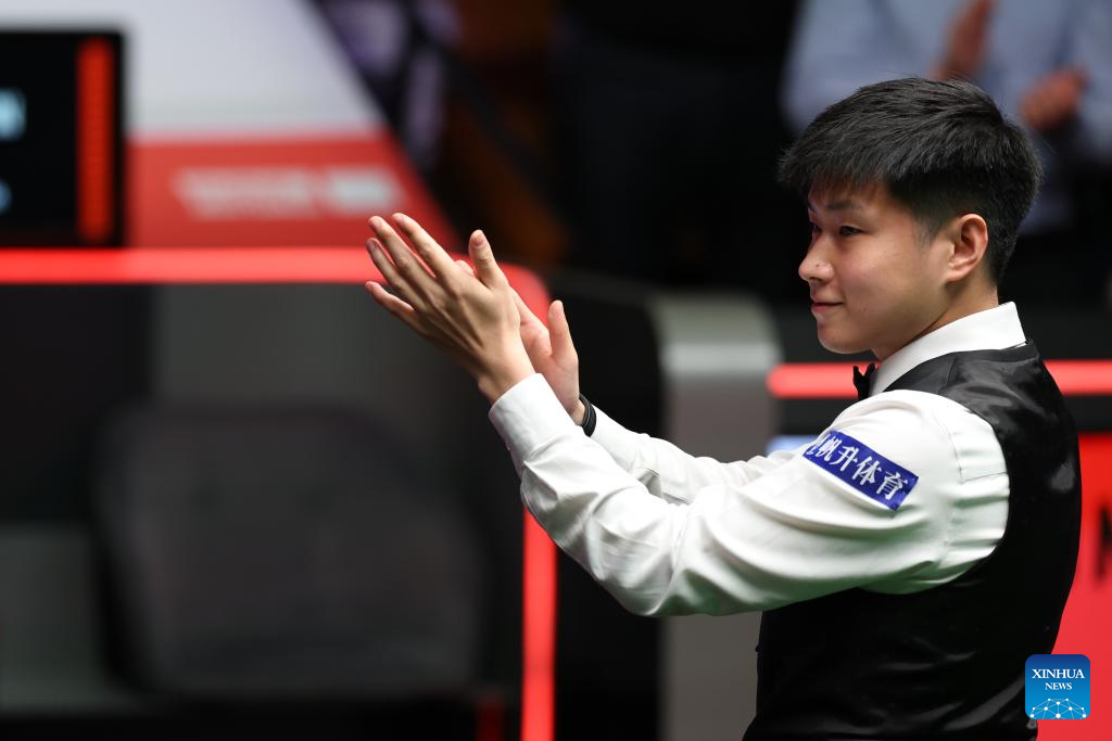 Zhao Xintong acknowledges the audience after winning the semifinal match between Ronnie O'Sullivan of England and Zhao Xintong of China at World Snooker Championship 2025 in Sheffield, Britain, May 2, 2025. (Photo by Zhai Zheng/Xinhua)