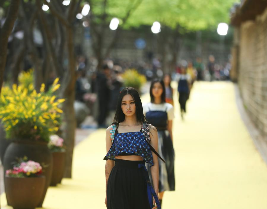 SEOUL, May 3 (Xinhua) -- Models wear designed hanbok in a fashion show held by the Seoul Metropolitan Government on the street in Seoul, the capital of South Korea.