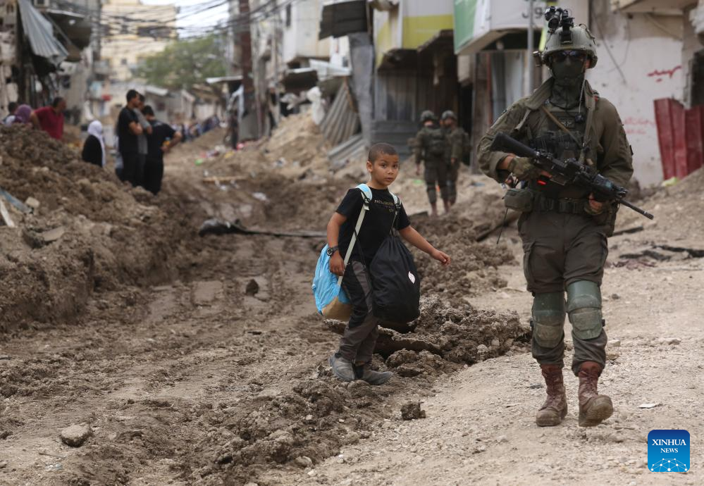 A Palestinian boy leaves home with his belongings after Israeli forces issued demolition orders in Tulkarm refugee camp, the northern West Bank, on May 2, 2025. (Photo by Nidal Eshtayeh/Xinhua)