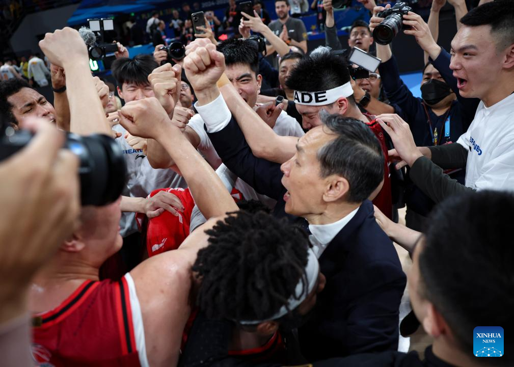 Beijing Ducks' head coach Xu Limin (front R) celebrates with players after the game 3 of the play-off semifinal between Beijing Ducks and Shanxi Loongs at the 2024-2025 season of the Chinese Basketball Association (CBA) league in Beijing, capital of China, May 2, 2025. (Xinhua/Luo Yuan)