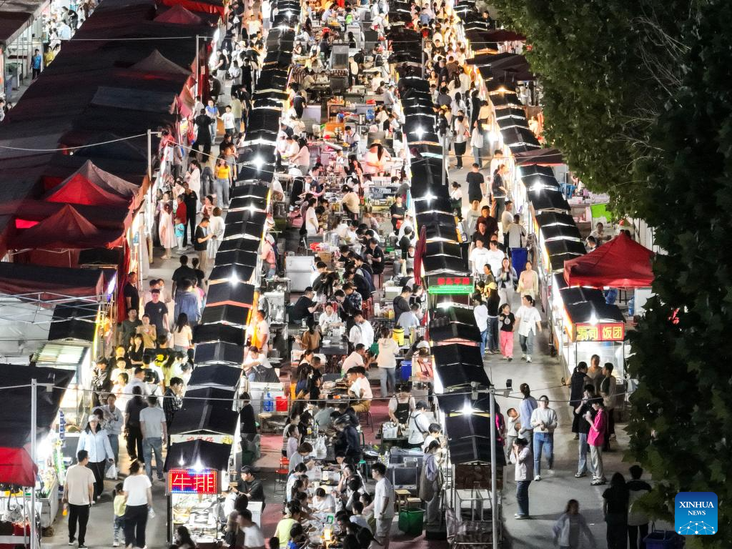 A drone photo shows tourists enjoying street snacks in Jiyuan City, central China's Henan Province, May 1, 2025.