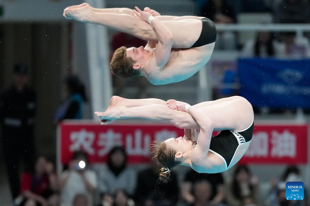 China's Chen Yuxi (front)/Cheng Zilong compete during the mixed 3m & 10m team final at the World Aquatics Diving World Cup 2025 Super Final in Beijing, capital of China, on May 2, 2025. (Xinhua/Ju Huanzong)
