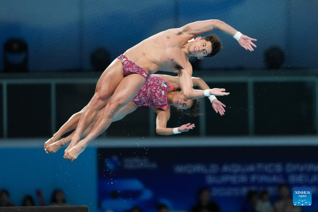 Mexico's Randal Willars Valdez (front)/Alejandra Estudillo Torres compete during the mixed 3m & 10m team final at the World Aquatics Diving World Cup 2025 Super Final in Beijing, capital of China, on May 2, 2025. (Xinhua/Ju Huanzong)
