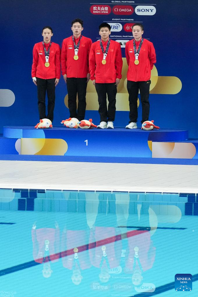 Gold medalists China's Chen Yuxi, Wang Zongyuan, Cheng Zilong and Chen Yiwen (L to R) attend the awarding ceremony of the mixed 3m & 10m team event at the World Aquatics Diving World Cup 2025 Super Final in Beijing, capital of China, on May 2, 2025. (Xinhua/Ju Huanzong)