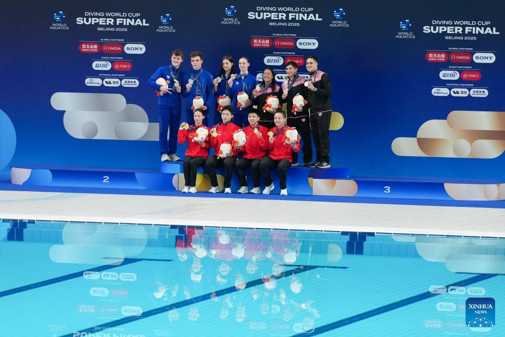 Gold medalists team China (front), silver medalists team Ukraine (L) and bronze medalists team Mexico pose during the awarding ceremony of the mixed 3m & 10m team event at the World Aquatics Diving World Cup 2025 Super Final in Beijing, capital of China, on May 2, 2025. (Xinhua/Ju Huanzong)