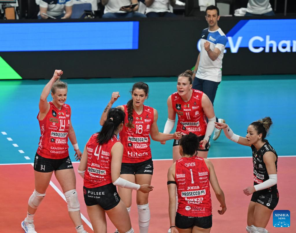 Players of Carraro Imoco Conegliano celebrate scoring during the women's semifinal between Carraro Imoco Conegliano of Italy and Numia Vero Volley Milano of Italy at CEV Champions League Volley 2025 in Istanbul, Türkiye, May 3, 2025. (Xinhua/Liu Lei)
