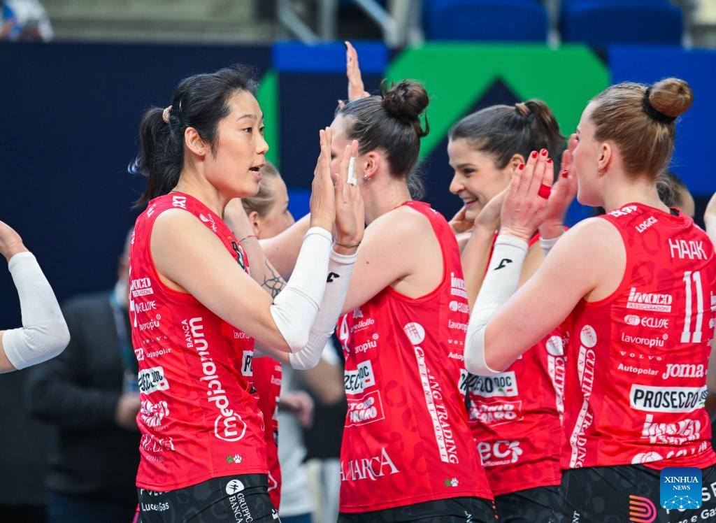 Zhu Ting (1st L) of Carraro Imoco Conegliano claps hands with teammates before the women's semifinal between Carraro Imoco Conegliano of Italy and Numia Vero Volley Milano of Italy at CEV Champions League Volley 2025 in Istanbul, Türkiye, May 3, 2025. (Xinhua/Liu Lei)