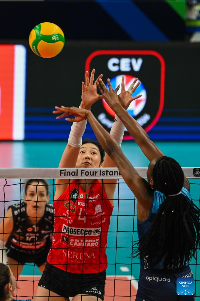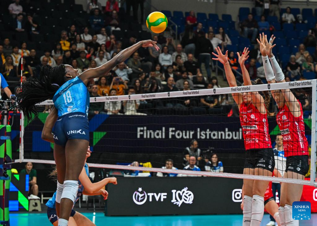 Zhu Ting (R) of Carraro Imoco Conegliano spikes the ball during the women's semifinal between Carraro Imoco Conegliano of Italy and Numia Vero Volley Milano of Italy at CEV Champions League Volley 2025 in Istanbul, Türkiye, May 3, 2025. (Xinhua/Liu Lei)