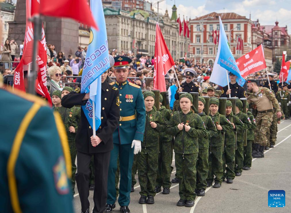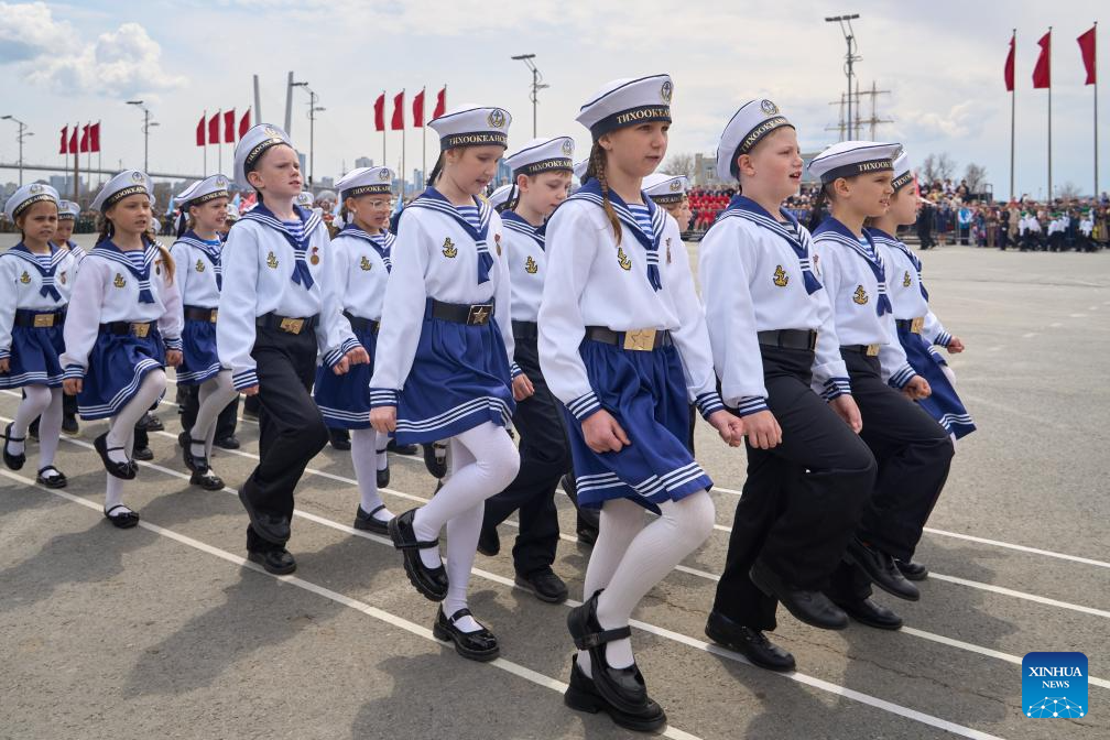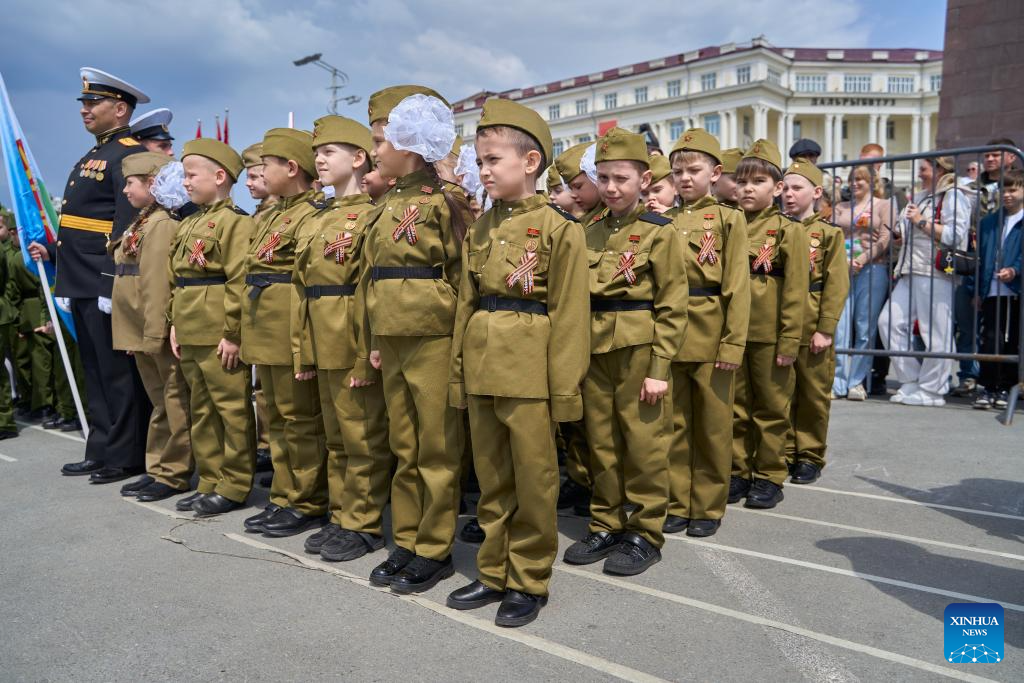 A formation of primary school students takes part in a "Great-grandchildren of Victory" parade to celebrate the 80th anniversary of the Victory in the Great Patriotic War in Vladivostok, Russia, May 4, 2025. (Photo by Guo Feizhou/Xinhua)