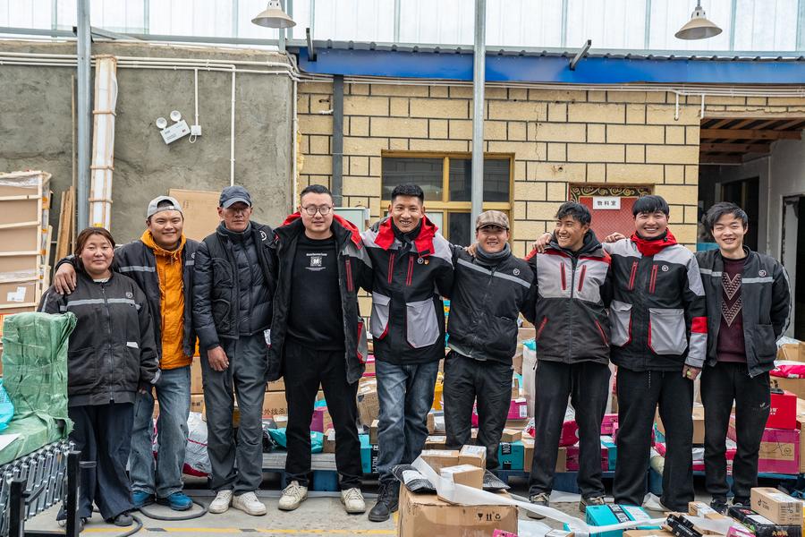 Laba (C) and his colleagues pose for a group photo at a delivery station in Nagqu, southwest China's Xizang Autonomous Region, April 24, 2025. (Xinhua/Tenzin Nyida)