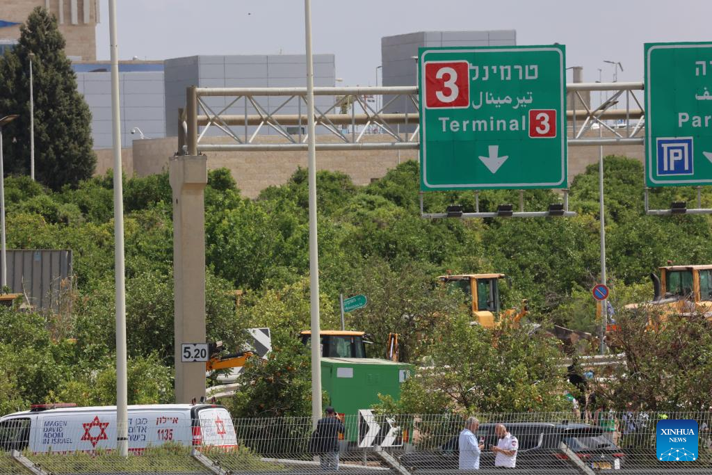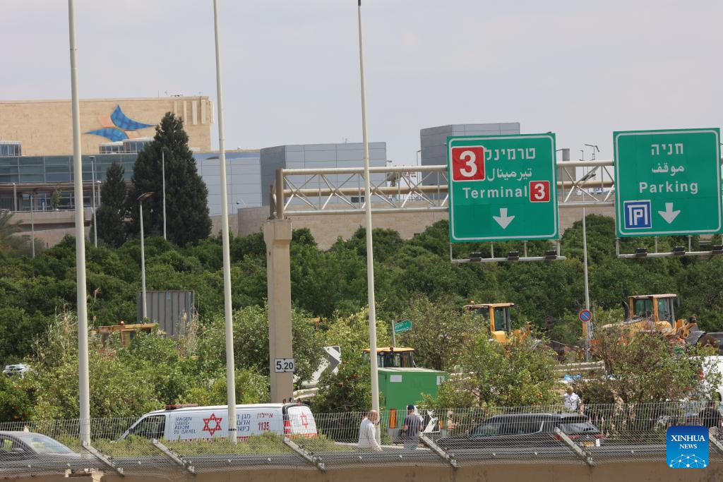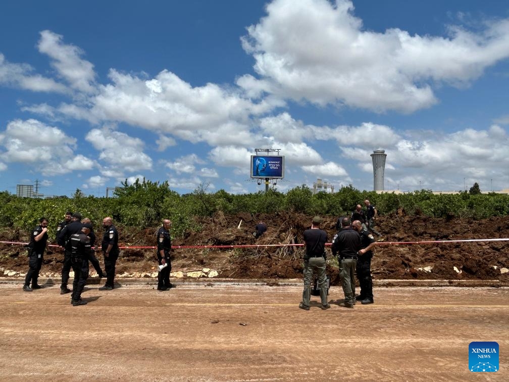 This photo taken on May 4, 2025 shows a cordoned-off area near Ben Gurion International Airport after a missile strike in Tel Aviv, Israel. A missile launched by Yemen's Houthi forces struck Israel's Ben Gurion International Airport on Sunday, injuring two people and causing damage, the Israeli military and local authorities said. The military said in a statement that aerial defense systems attempted to intercept the missile but failed. (Photo by Gil Cohen Magen/Xinhua)