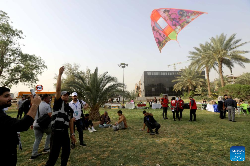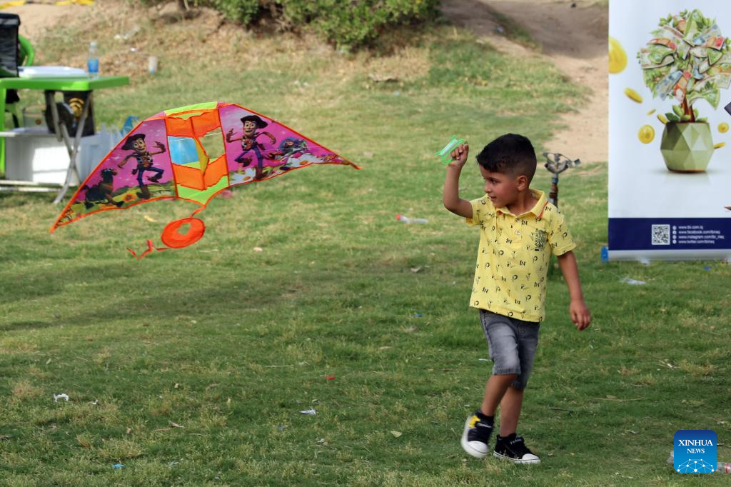 People have fun with their kites at the 8th Baghdad Kite Festival in Baghdad, Iraq, on May 3, 2025. The event kicked off on Saturday, attracting many locals. (Xinhua/Khalil Dawood)
