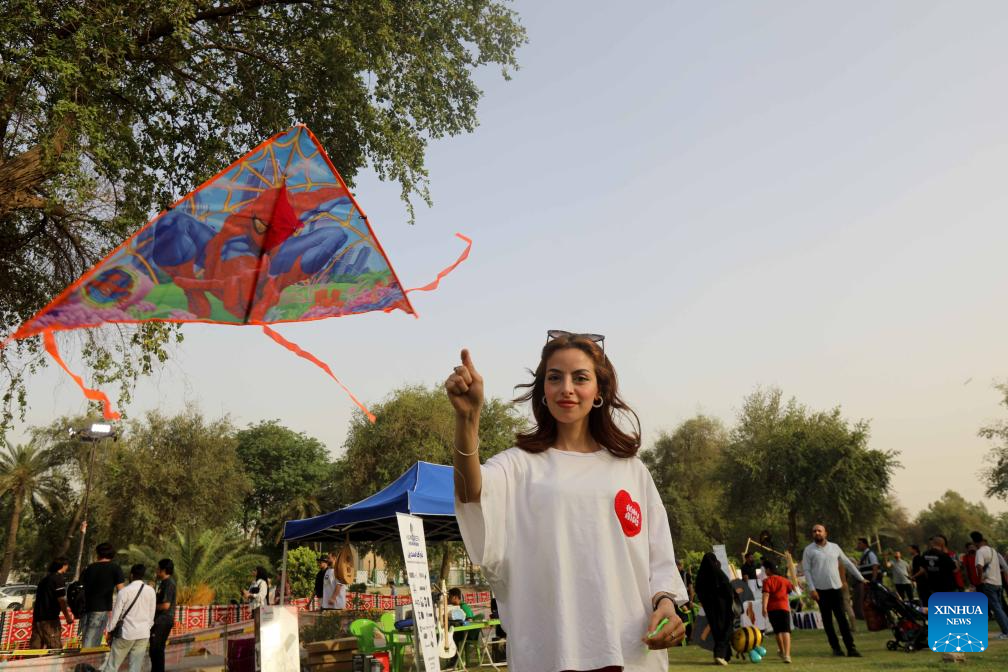 People enjoy themselves at the 8th Baghdad Kite Festival in Baghdad, Iraq, on May 3, 2025. The event kicked off on Saturday, attracting many locals. (Xinhua/Khalil Dawood)