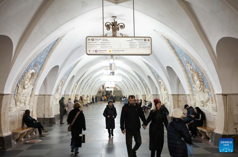 People are seen at a subway station in Moscow, Russia, April 27, 2025. (Xinhua/Bai Xueqi)